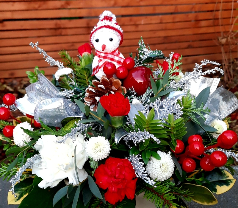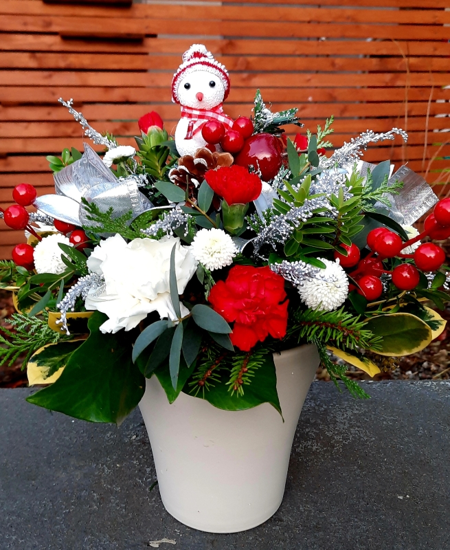 Cute arrangement with carnations holly berries seasonal foliage - and of course 'Frosty' the snowman - this is a long lasting arrangement in a ceramic pot.