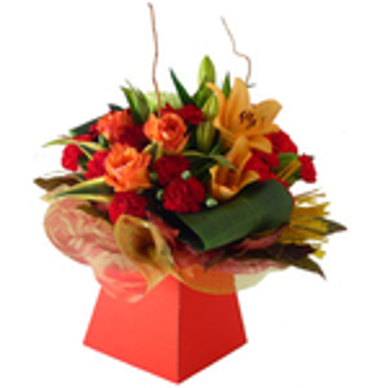 Premium seasonal flowers in reds yellow and orange, arranged by your florist, and presented in water in a gift box.