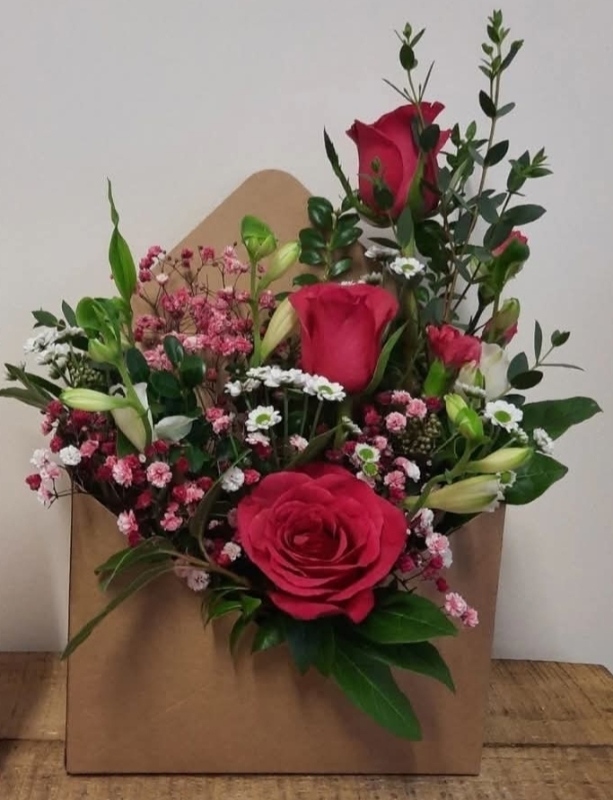 Pretty envelope arrangement, with three perfect Red Roses. Why not add a box of Chocolates or a Handmade Scented Candle...