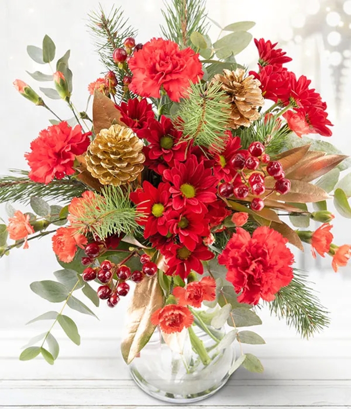 A traditional red, green and gold bouquet. Created with carnations, chrysanthemums, spray carnation, berries and Christmas foliage.