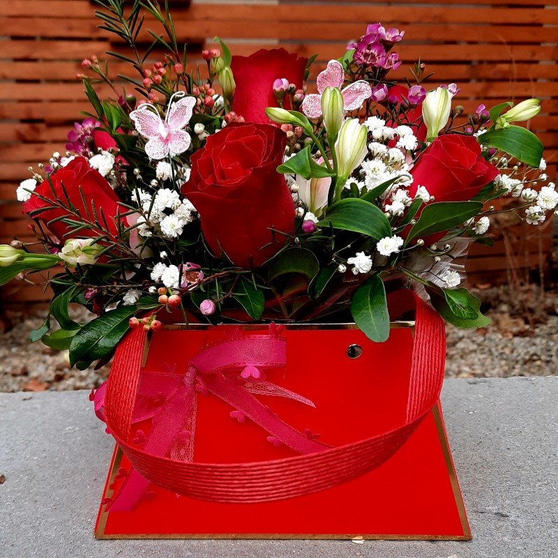 Pretty gift bag with 6 petit red roses - send lots of love and kisses with this cute arrangement - why not add some chocolates or a scented candle to create your own unique gift set.