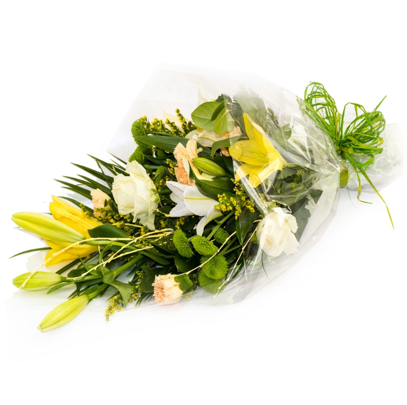 A simple wrap of mixed flowers to convey your message - this pretty bouquet contains vibrant yellow lilies, everyone's favourite gerbera and a selection of complimentary flowers and foliage.