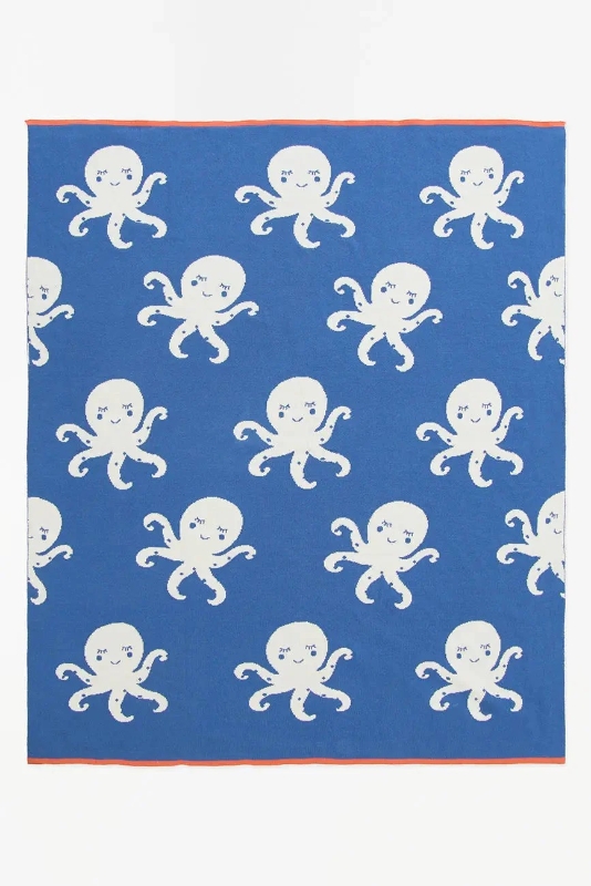 Soft cotton blanket with an octopus print, combining blue and white, and with an orange outline for a vibrant and modern touch. Ideal for keeping little ones warm and comfortable.